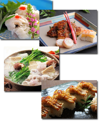 生命力の強い魚を食べると精がつくと言われます。鱧の落とし、鱧の山椒焼き、鱧の天麩羅、鱧しゃぶ・・・。祇園祭のコンチキチンを聞きながら、鱧の白い身に舌鼓を打つ・・・。鱧料理で京都の夏を感じてみてはいかがでしょうか。