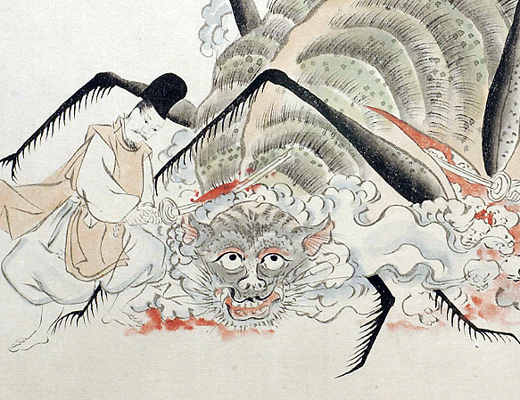 土蜘蛛と聞いてもピンと来ないかもしれませんが、能や狂言などの古典芸能で、蜘蛛の糸をパッと広げる演目と言えば、「あー、あれのこと!」とお分かりになるのではないでしょうか。今でこそ、土蜘蛛という妖怪を知る人は妖怪オタクだけかもしれませんが、江戸時代の頃は、女、子どもでも知っていると言われるほどにポピュラーな妖怪で、今で言えば、AKBやEXILEのように誰もが知る人気者だったようです。